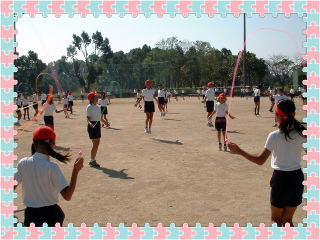 陸上記録会A 陸上記録会では、全員参加の5分間縄跳びがあります。5分間飛びつづけるのは大変ですが月野小では5年生の女子が5分間跳び切ることができました。 |