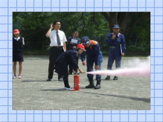 避難訓練がありました。「地震発生後,印刷室より出火」という設定で行われました。机の下に隠れた後,「おさない,かけない,しゃべらない,もどらない」「おかしも」を守って避難できました。避難した後は消防署の方から初期消火の方法を教えて頂きました。まずは「大声で助けを呼び119番する」「火の手が小さい場合は消火器を持って消火する」ことを学びました。5年生が代表で炎を消火してくれました。消火器を使うことが無いのが一番ですが,いざという時に対応できるためにも今後も防災意識の向上が必要ですね。