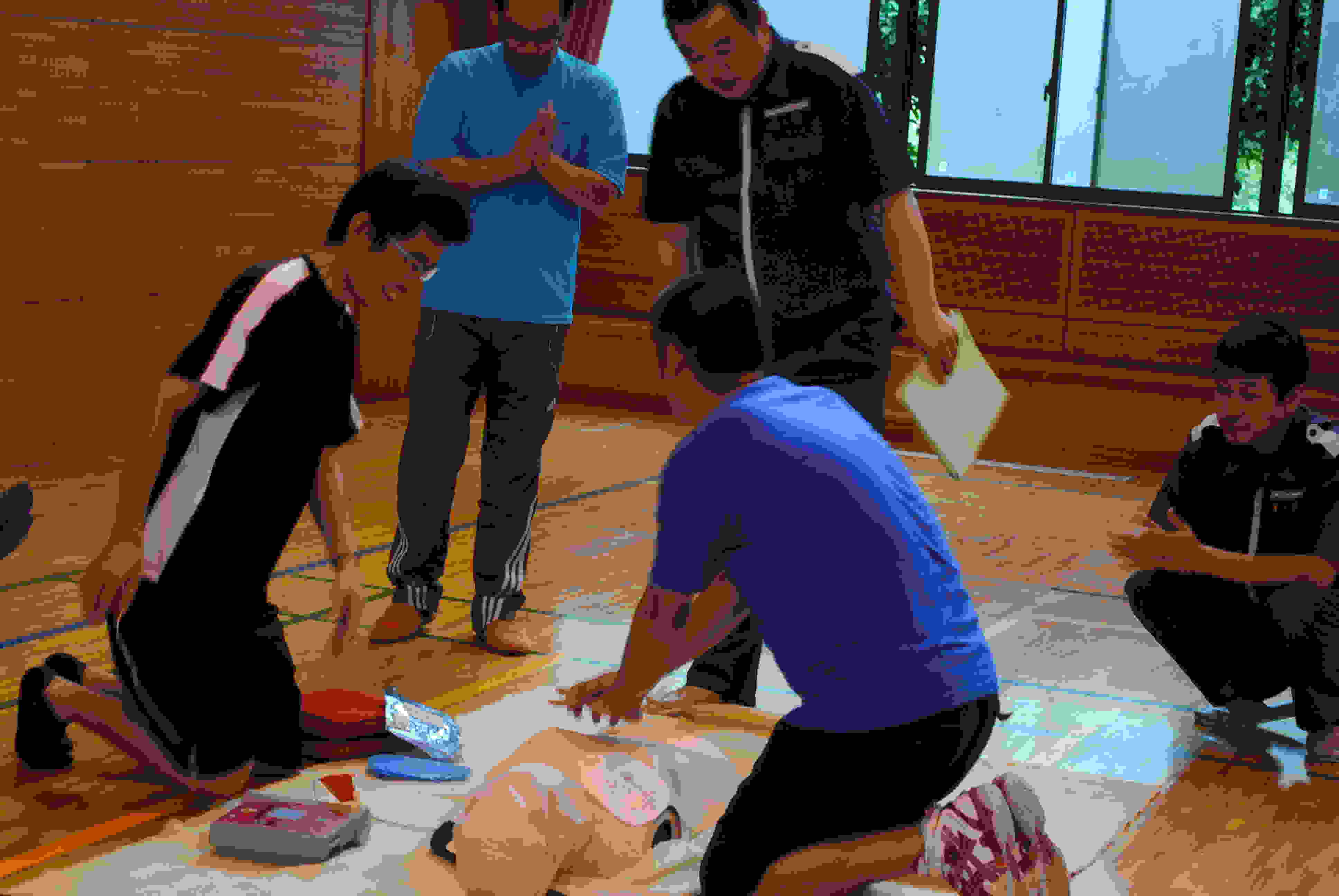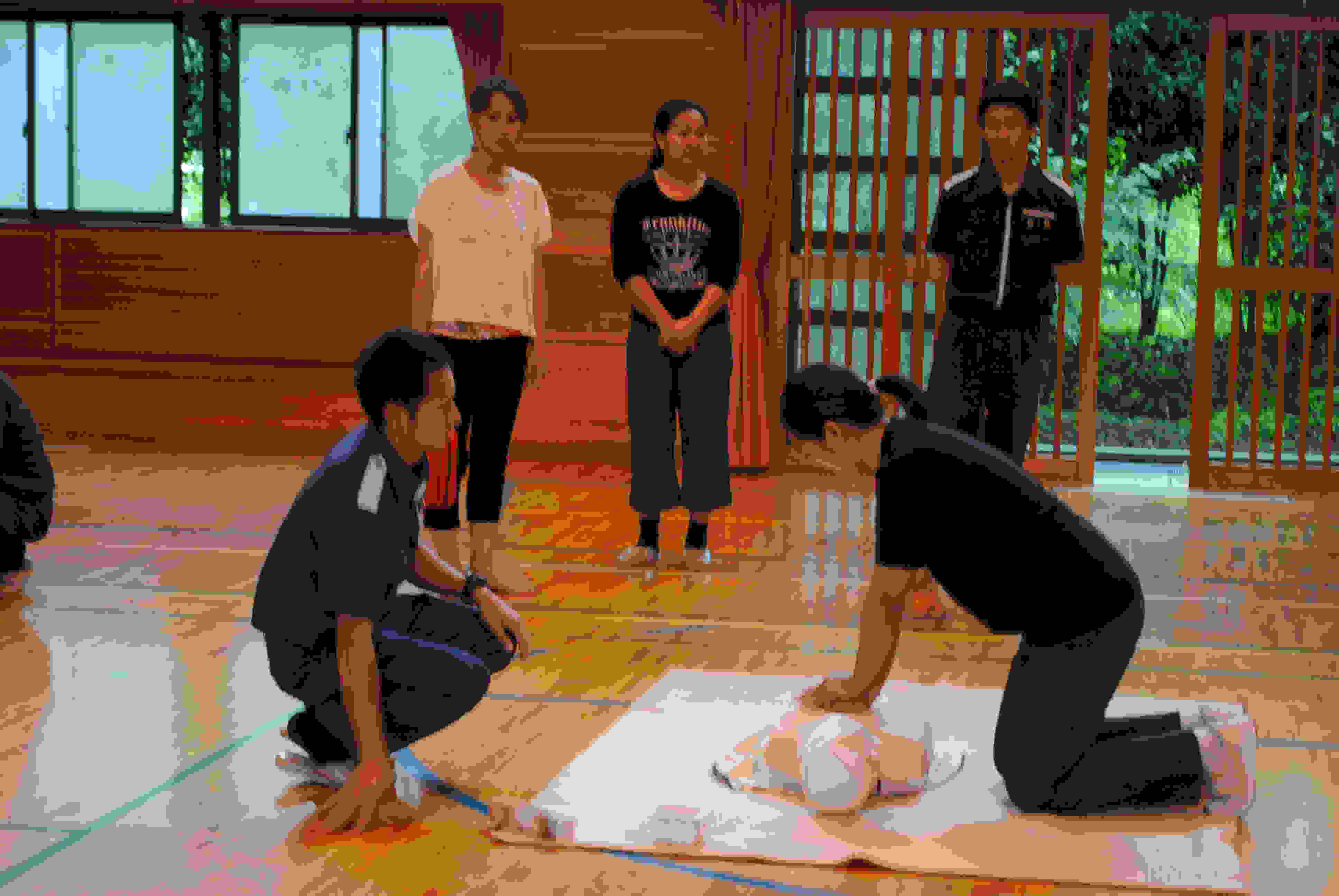 今年は、志布志の海上保安庁の方々にきていただいて、水難救助法講習会を実施しました。曽於市水泳記録会